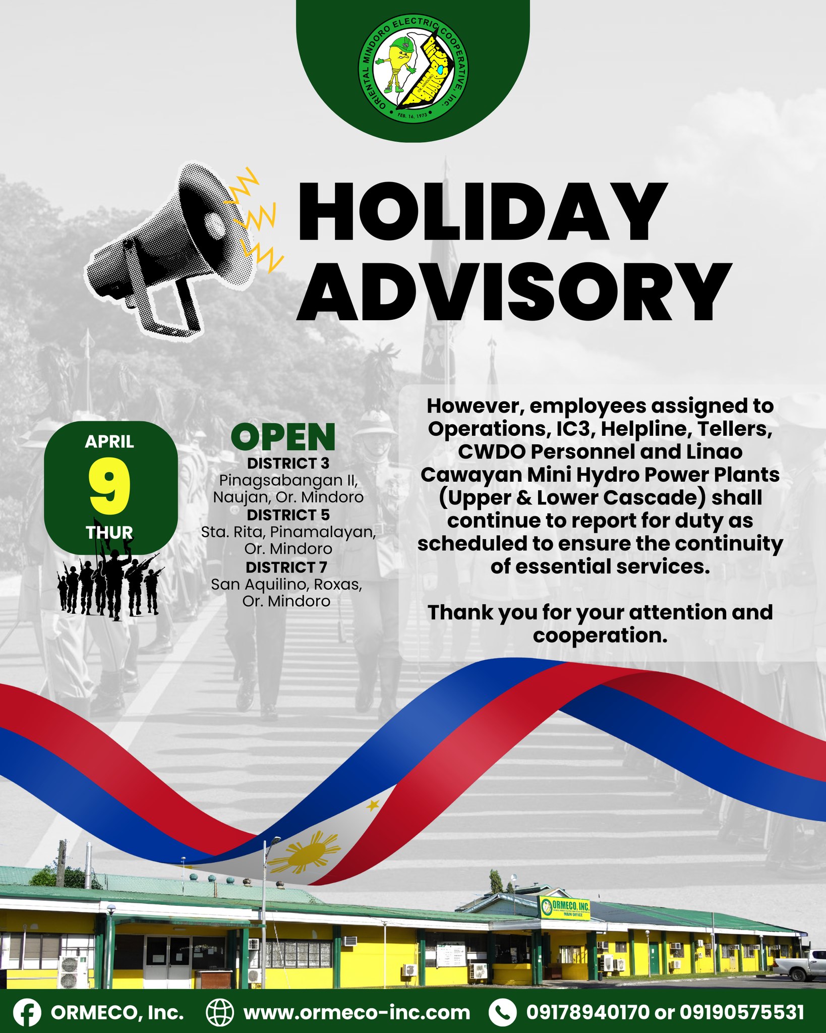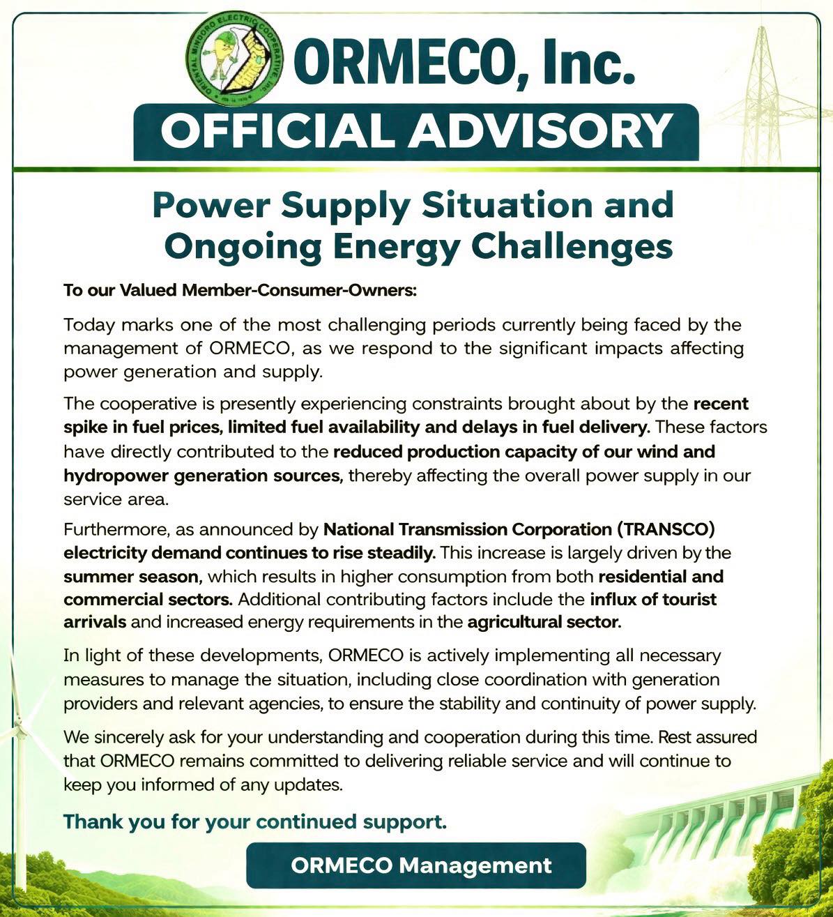 Oriental Mindoro Electric Cooperative, Inc. (ORMECO, Inc.) is a non-stock, non-profit and service-oriented rural Electric Cooperative, duly organized under existing Philippine laws, rules and regulation.
